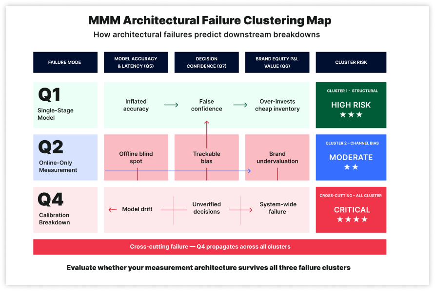 Q1 wrong drives repeated performance over-investment. Q2 wrong defunds offline channels because their revenue is unseen. Q3 wrong leaves 13 quarterly decisions made on dashboards while the model is prepared. Q4 wrong scales channels without proven ROI. Q5 wrong files recommendations while budgets follow last year. Q6 wrong cuts brand, with CAC compounding for 18 months. Q7 wrong delivers correct measurement after decisions are made. These are predictable outcomes of architectures not built for omnichannel retail. The direction of failure is nameable. That is what makes it preventable.