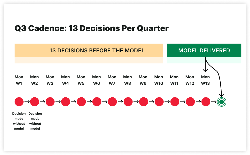13 decisions per quarter occur without the model while it is being prepared.