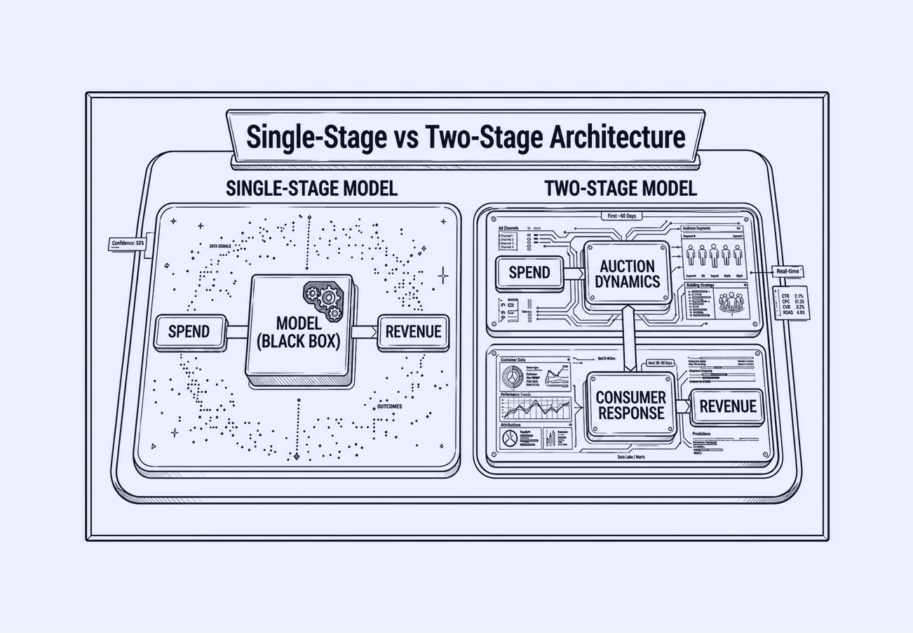 Allocation depends on effectiveness. If cost efficiency and consumer response are not modeled independently, channels are over-credited when auctions are cheap and under-credited when they tighten. This difference is not theoretical, it’s architectural, and it becomes obvious when you see how the two models are actually constructed. Single-stage models compress delivery and impact into one signal; two-stage architectures separate auction dynamics and consumer response so you can optimize true consumer impact, not auction efficiency.