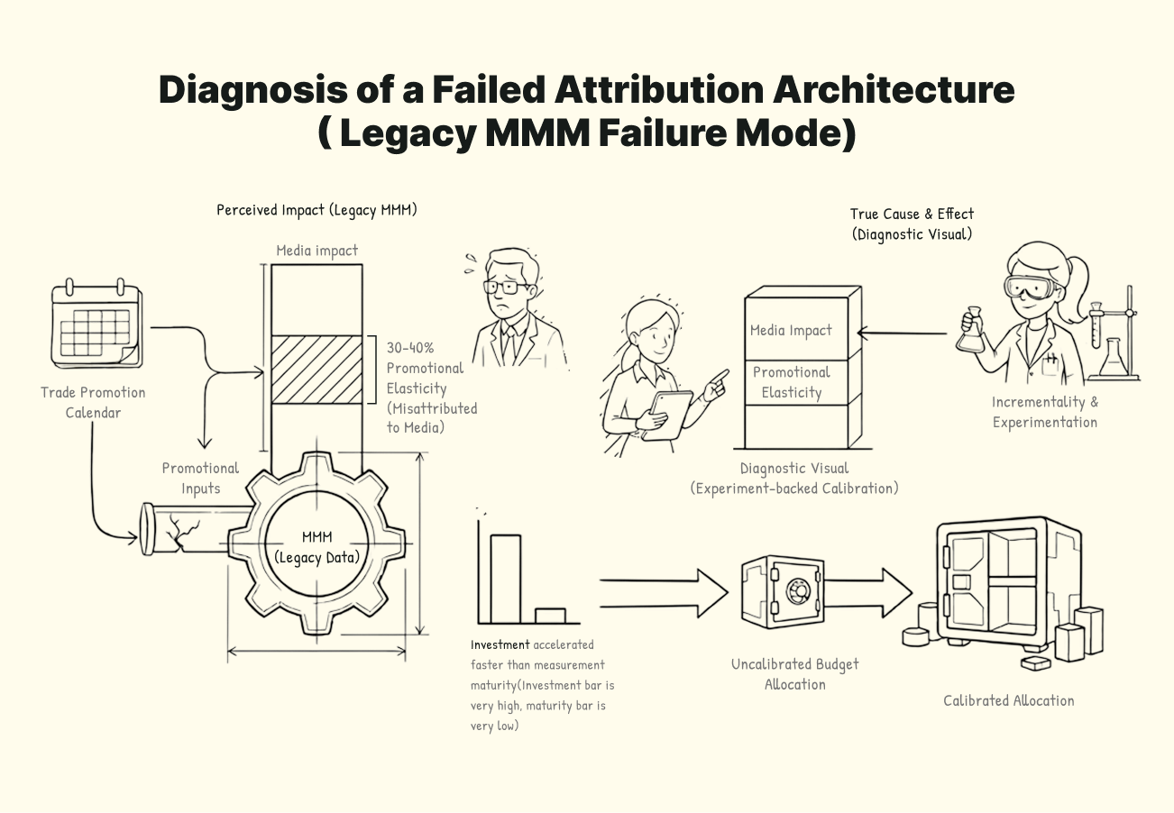 Industry research estimates up to 60% of digital marketing spend is wasted due to misattribution. The specific failure mode is this: brands using trade promotion calendars in their MMM routinely find that 30–40% of perceived media impact is actually promotional elasticity, a finding consistent across CPG category research and validated by LiftLab client analysis. The model credits the media campaign, even though the price reduction did most of the work. The problem is not with the platform or the talent. It is with the incrementality testing solution, operating at a scale most brands do not realize until the budget has already moved in the wrong direction.