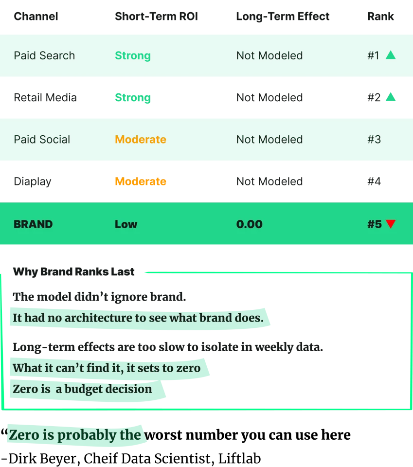 It is a mid-quarter review. Performance channels are looking strong. Paid search ROAS is up. Retail media is delivering. And sitting near the bottom of the MMM efficiency rankings, where it has been for two quarters running, is the brand. The CFO asks: “If a brand isn’t demonstrating measurable contribution in the model, why are we funding it?” The model agrees. Brand takes the cut. Performance gets the budget.